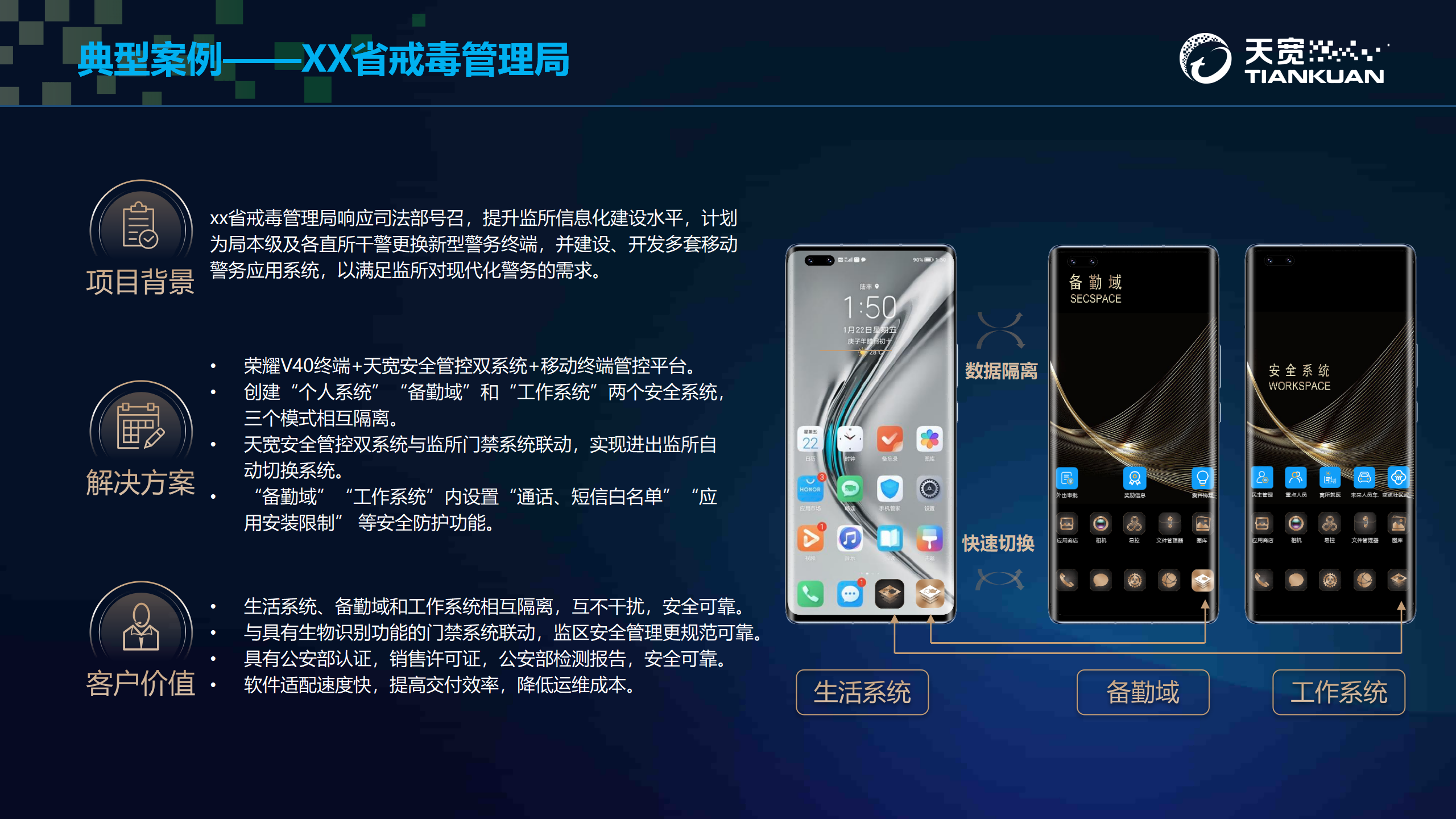 XX省戒毒管理局响应司法部号召,提升监所信息化建设水平,為(wèi)局本级及各直所干警更换新型警务终端,并建设、開(kāi)发多套移动警务应用系统,以满足监所对现代化警务的需求。