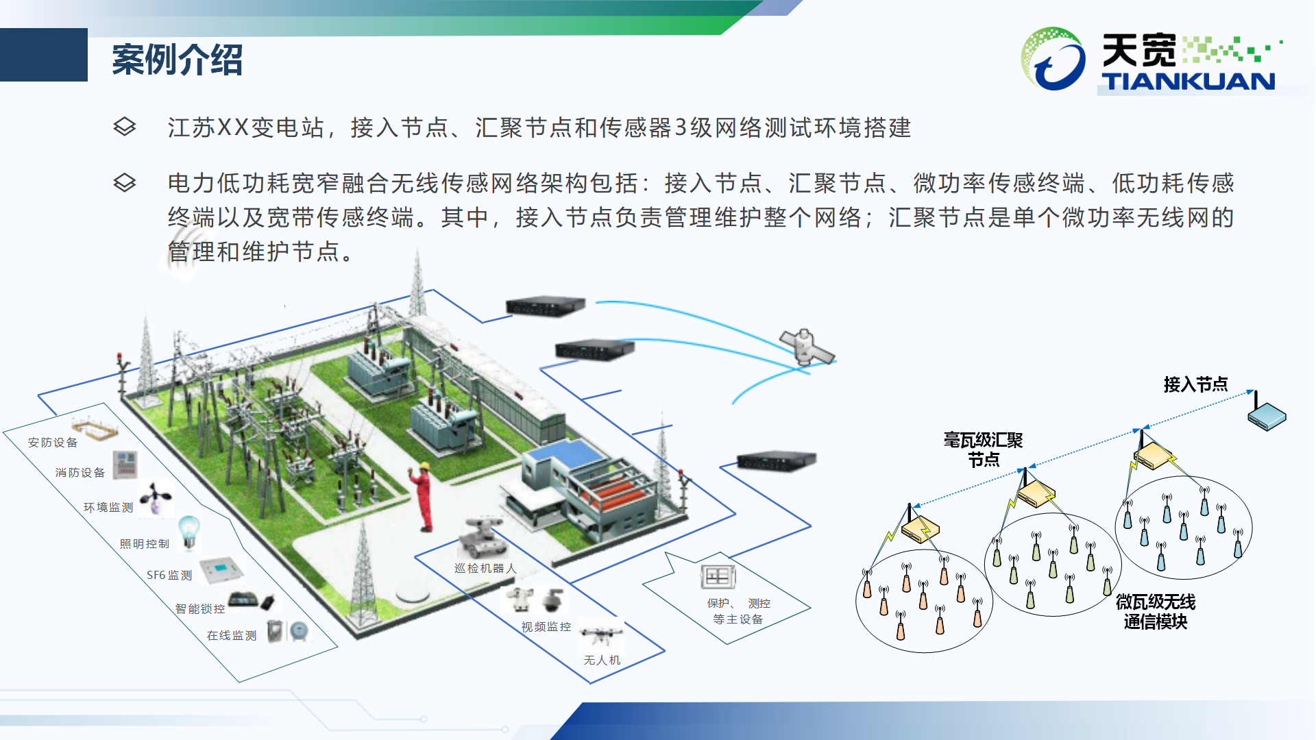 江苏XX变电站通(tōng)过接入节点、汇聚节点和(hé)传感器3级网络测试环境搭建。采用电力低(dī)功耗宽窄融合无线传感网络架构,包括:接入节点、汇聚节点、微(wēi)功率传感终端、低(dī)功耗传感终端以及宽带传感终端,有效提升电力物(wù)联网安全水平,确保电网安全运行(xíng)。