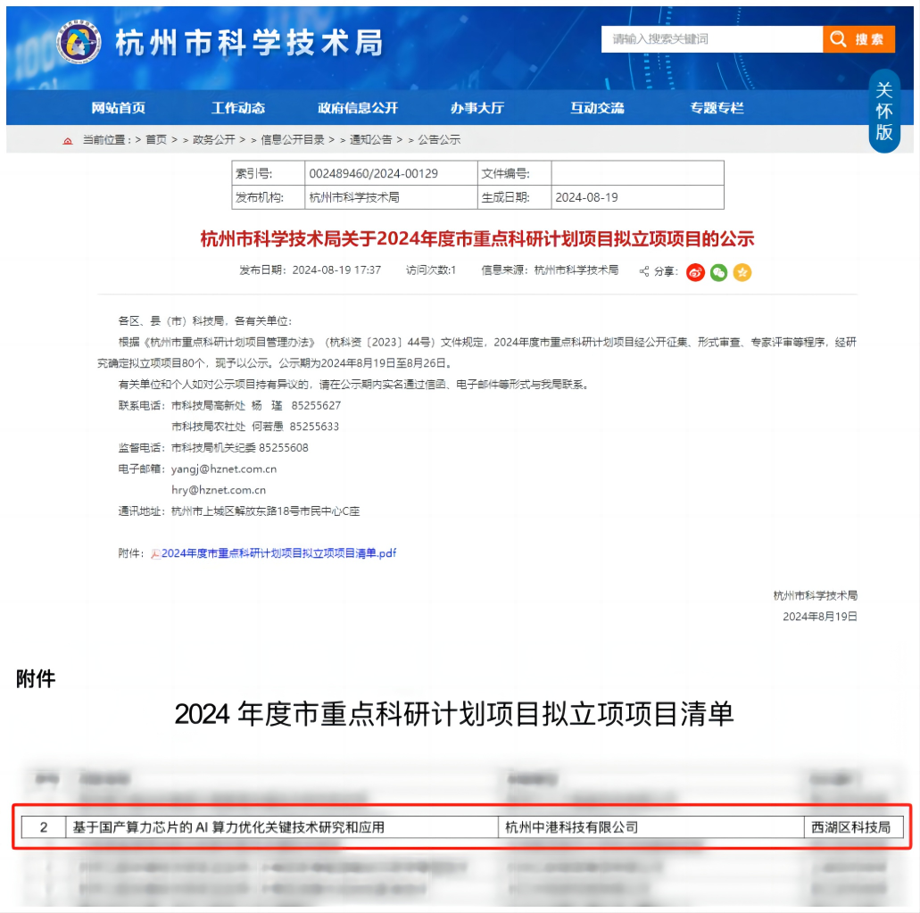 近日,经杭州市科技局公示,由天宽旗下(xià)公司中港科技牵头与杭州电子科技大学、杭州人(rén)工(gōng)智能(néng)计算中心、杭州市第一(yī)人(rén)民醫(yī)院联合申报的“基于國(guó)产算力芯片的 AI 算力优化关键技術(shù)研究和(hé)应用”项目成功获批2024年(nián)度市重点科研计划项目立项。