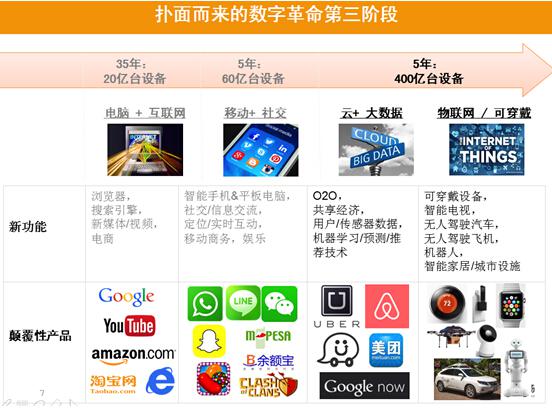 首先谈一(yī)下(xià)全球的趋势。如(rú)果我们回顾一(yī)下(xià),40年(nián)前,那(nà)个時(shí)候其实还没有什么PC的概念,但(dàn)是过去這(zhè)40多年(nián)我们看(kàn)到了(le)两次巨大的革命,第一(yī)次我们可(kě)以称為(wèi)是PC革命和(hé)因特网革命,這(zhè)段時(shí)間(jiān),有20亿台的设备,让我们很(hěn)多人(rén)有PC,有手机,開(kāi)始上(shàng)网,带来了(le)新的应用,带来很(hěn)多了(le)不起的全球公司。30年(nián)的努力之下(xià),过去的五年(nián)就已经把30年(nián)的发展变成是微(wēi)不足道(dào)的,过去五年(nián)是移动互联网的崛起,以及整个社交网络的崛起,這(zhè)两件事情不仅让人(rén)联上(shàng)了(le)PC,而且人(rén)联上(shàng)了(le)人(rén),随時(shí)在网,可(kě)以随時(shí)随地(dì)找到另外(wài)一(yī)个人(rén)的社交和(hé)沟通(tōng)工(gōng)具,這(zhè)样的一(yī)个革命,让我们35年(nián)才看(kàn)到了(le)21亿台的设备,這(zhè)五年(nián)成長(cháng)到60亿,在這(zhè)五年(nián)之內(nèi),我们经过平板和(hé)智能(néng)手机就把过去的PC的革命,看(kàn)起来非常微(wēi)不足道(dào)。待会我们会再往下(xià)看(kàn),会看(kàn)到未来的革命更巨大。世界领先的公司,在哪些方面改变了(le)人(rén)们每一(yī)天的习惯,美國(guó)的公司、中國(guó)的公司真的是在领跑全球。过去看(kàn)書(shū)可(kě)能(néng)是紙(zhǐ)的書(shū),现在对年(nián)轻人(rén)来说网上(shàng)阅读基本上(shàng)取代了(le)紙(zhǐ)质的書(shū)。最近的业界的合并,嘀嘀快(kuài)的都(dōu)已经介入,改变了(le)过去打车的方式。过去买东西(xī),都(dōu)是在实体的店,现在越来越到淘宝、天猫等购买。过去拍照都(dōu)是用很(hěn)大的相机,现在基本上(shàng)用手机,美图秀秀這(zhè)样的软件。支付的方式,原来是紙(zhǐ)质,现在用余额宝,如(rú)果思考一(yī)下(xià),回到十年(nián)前,把今天的小米手机交给十年(nián)前的你,告诉他(tā)這(zhè)些东西(xī)怎么用,那(nà)个十年(nián)前的你,一(yī)定会非常惊讶,以為(wèi)你是来自(zì)時(shí)光(guāng)机器,或者科幻电影,怎么這(zhè)么神气?因為(wèi)我们用的习惯了(le),所以忘记了(le)十年(nián)之內(nèi)革命性的改变,所以当我们回顾过去的時(shí)候,不要(yào)认為(wèi)手机慢(màn)慢(màn)来的,其实它是非常快(kuài)的速度改变提升了(le)我们生活的细节,改变了(le)我们生活、工(gōng)作(zuò)、交朋(péng)友(yǒu)、购物(wù)。我们做(zuò)的事情,已经被移动互联网颠覆了(le),這(zhè)是今天发生的事情。