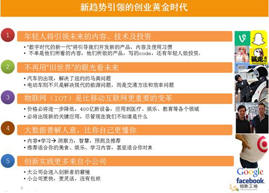 再更细节的谈一(yī)下(xià),刚才谈到400亿台机器它可(kě)以從(cóng)我们的未来发展,有五个趋势能(néng)够引领。第一(yī)个,因為(wèi)未来是年(nián)轻人(rén)引领的一(yī)个世界,我们认為(wèi)过去是张朝阳他(tā)们引领的精英時(shí)代,没有错,但(dàn)是真正使用的是我们的成長(cháng),我们的脑里被灌输了(le)很(hěn)多陈舊(jiù)、无法移除的东西(xī),我们就认為(wèi)知识什么样子,越年(nián)轻他(tā)们会越接触到新的技術(shù),新的产品,可(kě)能(néng)怀疑我怎么這(zhè)么说。在座有孩子的,你们可(kě)以想一(yī)下(xià),你们用微(wēi)信,是不是孩子教你们的,你们第一(yī)次上(shàng)网,用网站是不是孩子教你们的,你们去优酷、土(tǔ)豆、樂(yuè)視(shì)看(kàn)視(shì)頻(pín),是不是他(tā)们教你们的,用豆拍来拍一(yī)个东西(xī),是不是他(tā)们教你们的,這(zhè)些所有的有趣的东西(xī),其实都(dōu)是孩子们。因為(wèi)互联网時(shí)代,看(kàn)小朋(péng)友(yǒu)一(yī)直在划电視(shì)屏、雜(zá)志屏,他(tā)们认為(wèi)一(yī)切东西(xī)都(dōu)是被滑动的,年(nián)轻人(rén)喜欢轻松有趣更短更快(kuài)的,而且能(néng)动,而且能(néng)够互动的东西(xī),所以他(tā)们真的是引领時(shí)代的。所以你想知道(dào),什么APP会火(huǒ)起来,或者想知道(dào),什么形式的內(nèi)容会被更多的人(rén)使用,我们的95后是一(yī)个指标性的時(shí)代引领者。虽然你觉得孩子不听话,或者老(lǎo)看(kàn)无聊的东西(xī),但(dàn)是我可(kě)以保证,90后会跟95后学习,85后会跟90后学习,80后跟85后学习,60、70后就不一(yī)定了(le)。由年(nián)轻人(rén)引领內(nèi)容,一(yī)定是一(yī)个趋势。待会我们讲到未来真的是年(nián)轻人(rén)投资给年(nián)轻人(rén)的产品,年(nián)轻人(rén)写的东西(xī)给年(nián)轻人(rén)看(kàn),给年(nián)轻人(rén)玩(wán)儿,這(zhè)是未来的趋势。回顾过去我们在工(gōng)业革命的時(shí)候,还在用着农业思维思考事情的時(shí)候,不会在工(gōng)业革命里面引领世界,我们在座的就是所谓的农业革命的人(rén),這(zhè)些小小的真正工(gōng)业革命出来的,以后就要(yào)引领我们的,我们都(dōu)要(yào)多跟他(tā)们学习。我们创新工(gōng)场想投资什么案子,都(dōu)会给小朋(péng)友(yǒu)看(kàn)一(yī)看(kàn)。现在我已经不给大女(nǚ)儿看(kàn)了(le),她已经23岁,小女(nǚ)儿还有希望,我们的投资团队越来越年(nián)轻,到了(le)晚上(shàng)他(tā)们会把自(zì)我催眠成為(wèi)一(yī)个95后,上(shàng)网去做(zuò)95后的事情,這(zhè)样才能(néng)与時(shí)俱进。
