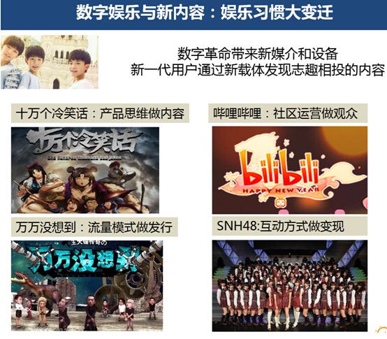 最后一(yī)点举例的是,這(zhè)里面说了(le)很(hěn)多是年(nián)轻人(rén)所引领的,在创新工(gōng)场我们很(hěn)多的投资总监经理,冒充青少(shǎo)年(nián)玩(wán)各种东西(xī),玩(wán)了(le)之后,告诉我们有几个特别有趣的东西(xī),十万个冷(lěng)笑话是一(yī)个纯粹用互联网制造动畫(huà)的过程,而且是社區(qū)里面提取出来的东西(xī)。万万没想到,也是一(yī)个互联网带来的一(yī)个网上(shàng)的剧,而且把无名的人(rén)变成了(le)在中國(guó)非常知名的明(míng)星。哔哩哔哩,很(hěn)多90后的食品在這(zhè)里分享和(hé)看(kàn)。SNH48虽然是女(nǚ)子的歌(gē)唱团,实际上(shàng)他(tā)们形成了(le)一(yī)个巨大的社區(qū),让很(hěn)多的人(rén)不但(dàn)能(néng)够实际参与,能(néng)够看(kàn)這(zhè)些可(kě)爱的女(nǚ)孩的表演,歌(gē)舞(wǔ)、电視(shì),上(shàng)了(le)五个春晚等等。除此之外(wài),有一(yī)个虚拟的APP给他(tā)互动,這(zhè)可(kě)能(néng)也是新的互联网模式。其实這(zhè)些东西(xī),都(dōu)是95后或者90后他(tā)们玩(wán)出来的,要(yào)了(le)解下(xià)一(yī)个趋势是什么,未来的80后90后要(yào)做(zuò)什么,真的要(yào)看(kàn)他(tā)们,更多的眼球是要(yào)放在更移动式互联网式,互动式的內(nèi)容里面。如(rú)果我们说出版业还在想,电子書(shū)会怎么影响我们,网上(shàng)新闻怎么影响我们,那(nà)已经慢(màn)了(le)一(yī)步,实际上(shàng)90后00后关注的不是文字的內(nèi)容,更多的是互动式的內(nèi)容。