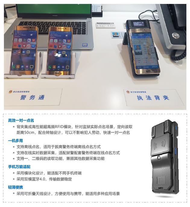天宽科技作(zuò)為(wèi)移动生态解决方案提供商,出席此次展会。现场展出的是天宽科技最新研发的采集外(wài)设 “智慧监狱”移动警务背夹 ,通(tōng)过搭载警务通(tōng)终端构成智慧监狱“人(rén)員(yuán)”、“工(gōng)具”清点的移动警务方案,亮相浙江监狱展區(qū)。