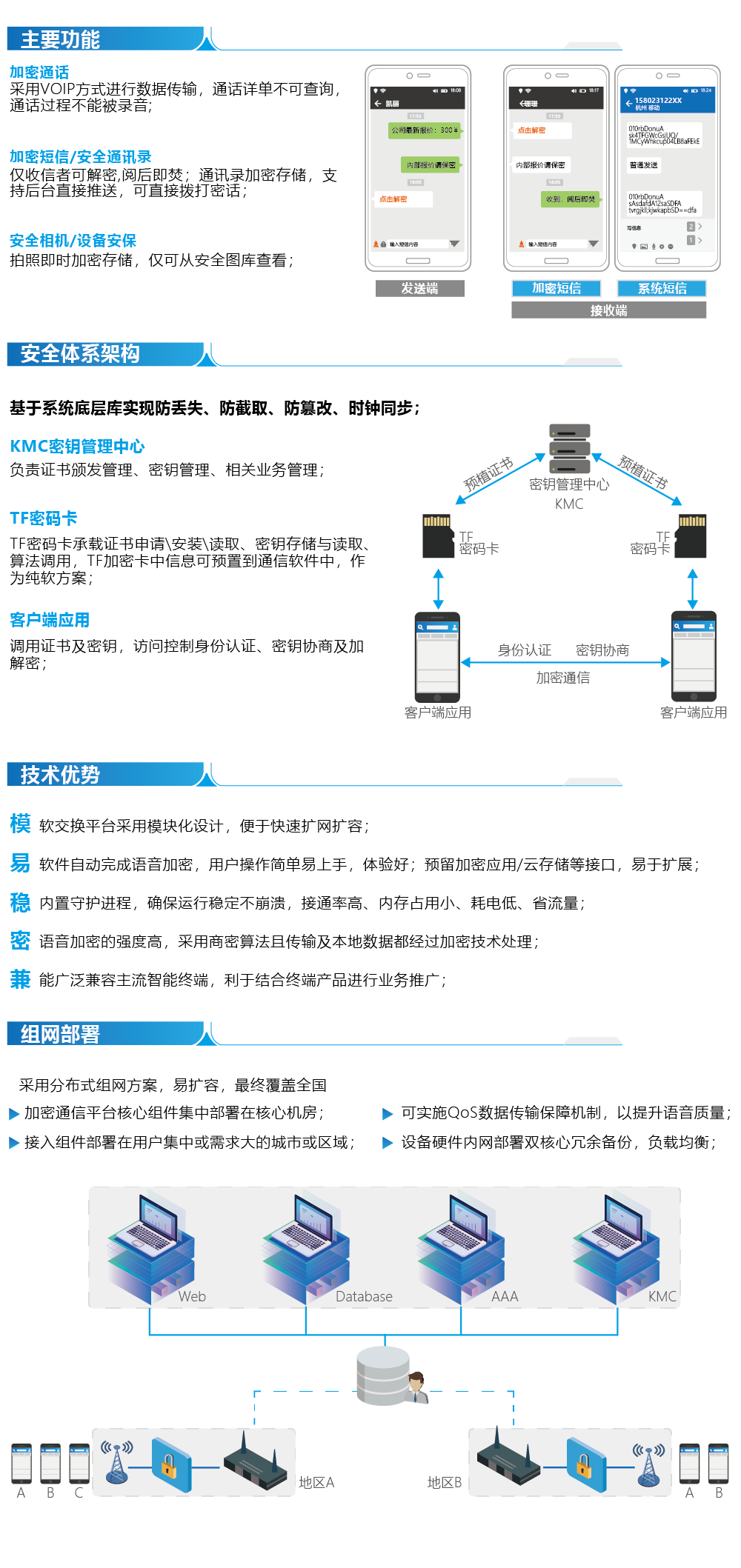 內(nèi)网移动加密通(tōng)信系统——天宽加密通(tōng)信系统是经國(guó)家密码管理局认证的商密级手机加密防护系统,符合我國(guó)商密级别的手机通(tōng)信要(yào)求。通(tōng)过移动3G/4G/WIFI方式进行(xíng)加密數(shù)据的传输,具备加密通(tōng)话、加密短信、安全通(tōng)信记录、安全通(tōng)讯录等功能(néng)。主要(yào)用于有效保障移动通(tōng)信安全,实现商密级的端到端的手机语音与短信加密,為(wèi)党、政、军、大型企业等重要(yào)客户提供专业化的高安全性的移动通(tōng)信加密服务。