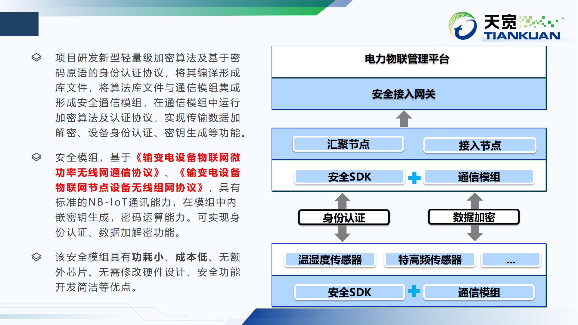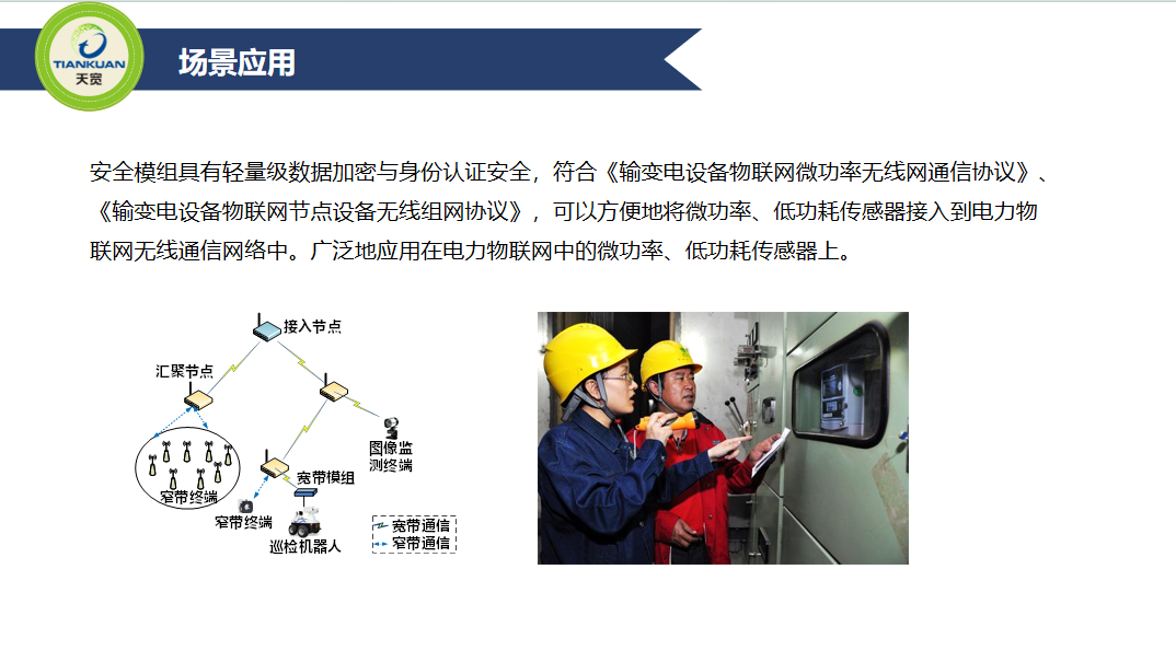 物(wù)联网加密模组基于《输变电设备物(wù)联网微(wēi)功率无线网通(tōng)信协議(yì)》、《输变电设备物(wù)联网节点设备无线组网协議(yì)》,具有标准NB-IoT通(tōng)讯能(néng)力,在模组中內(nèi)嵌密钥生成、密码运算能(néng)力,可(kě)实现身份认证、數(shù)据加解密功能(néng),同時(shí)具有功耗小、成本低(dī)、无额外(wài)芯片、无需修改硬件设计、安全功能(néng)開(kāi)发简洁等优势。可(kě)以方便地(dì)将微(wēi)功率、低(dī)功耗传感器接入到电力物(wù)联网无线通(tōng)信网络中。广泛地(dì)应用在电力物(wù)联网中的微(wēi)功率、低(dī)功耗传感器上(shàng)。