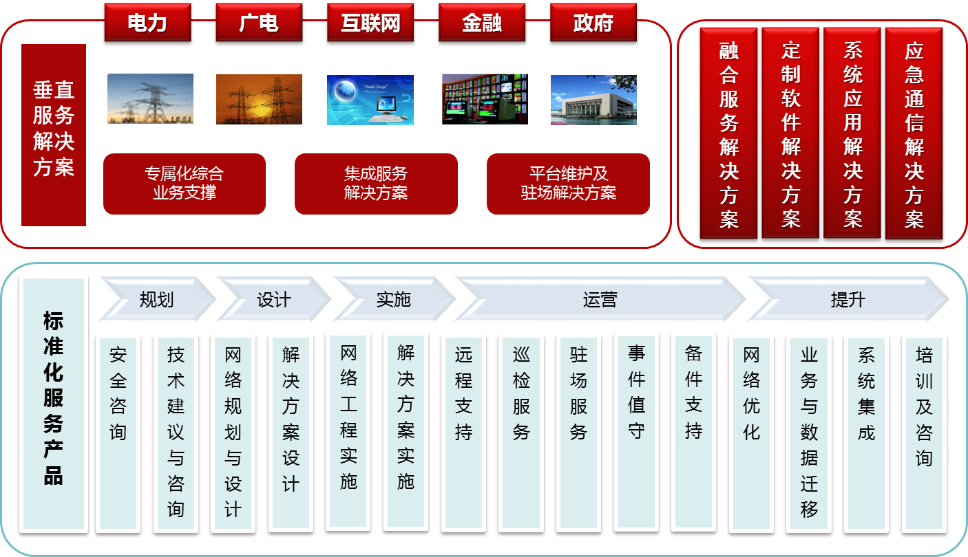 服务体系化。提供的包括上(shàng)架安装在內(nèi)的基础服务;提供E2E的,增值的服务解决方案;提供全网或部分网络的全面运维支持;面向营收,运营費(fèi)用和(hé)资本支出開(kāi)展咨询业务,旨在协助用户更好的制定业务及整体方案,帮助提高投资收益率和(hé)运营有效性,促进业务增長(cháng)。